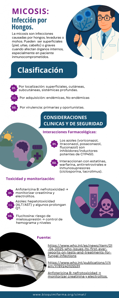 Las infecciones fúngicas pueden ser superficiales o comprometer órganos vitales, especialmente en pacientes inmunocomprometidos. Conocer su clasificación, diagnóstico y consideraciones clínicas es fundamental para la prevención y el tratamiento oportuno. Fuente: Organización Mundial de la Salud (OMS), NCBI, IDSA.
